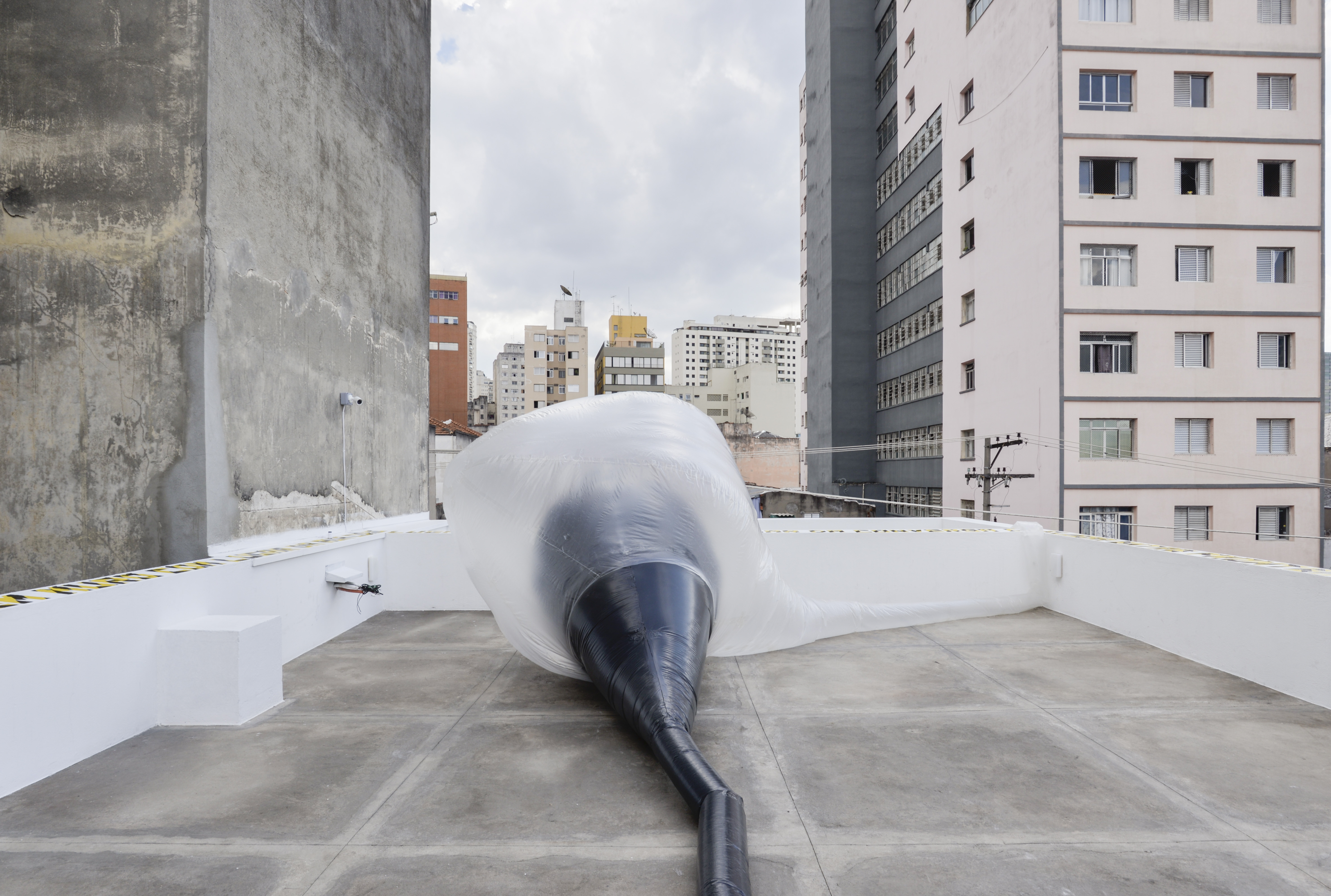 Como os dois infláveis tinham furos, eles nunca poderiam atingir a sua plenitude de pressão a não ser que eles fossem os dois simultaneamente tapados. A expansão completa das figuras só pôde se dar porque a bolha transparente, ao inflar, tentava expulsar a preta para fora pela pressão interna produzida e, ao fazer isso, transformava a outra figura não mais num parasita mas numa rolha que permitia vedar seu próprio buraco e inflar a si completamente, e vice-versa. Como se pode imaginar, lona plástica - quase saco de lixo - e durex não são materiais altamente duráveis e resistentes, por vezes o sol e vento que soprava na laje desfazia esse pequeno arranjo e interrompia o equilíbrio existente. Essa desorganização durava até que, depois das intempéries, as duas bolhas pudessem voltar para sua estabilidade momentânea.